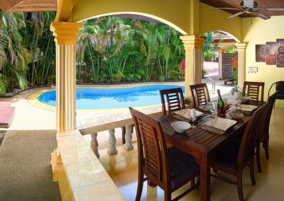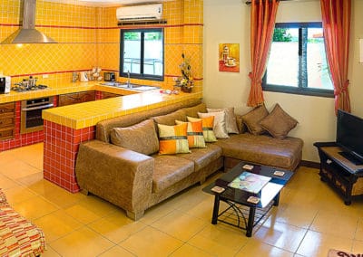 Beautifully furnished and decorated, outside the turquoise pool is fringed by coconut trees and overhanging fan palms helping you feel at one with nature and making a perfect setting for some poolside fun. A shaded alfresco dining patio overlooks the pool and the open-plan living room is bright and spacious with quality furniture and full-width sliding doors opening out to the pool and the kitchen comes well equipped with appliances and utensils.