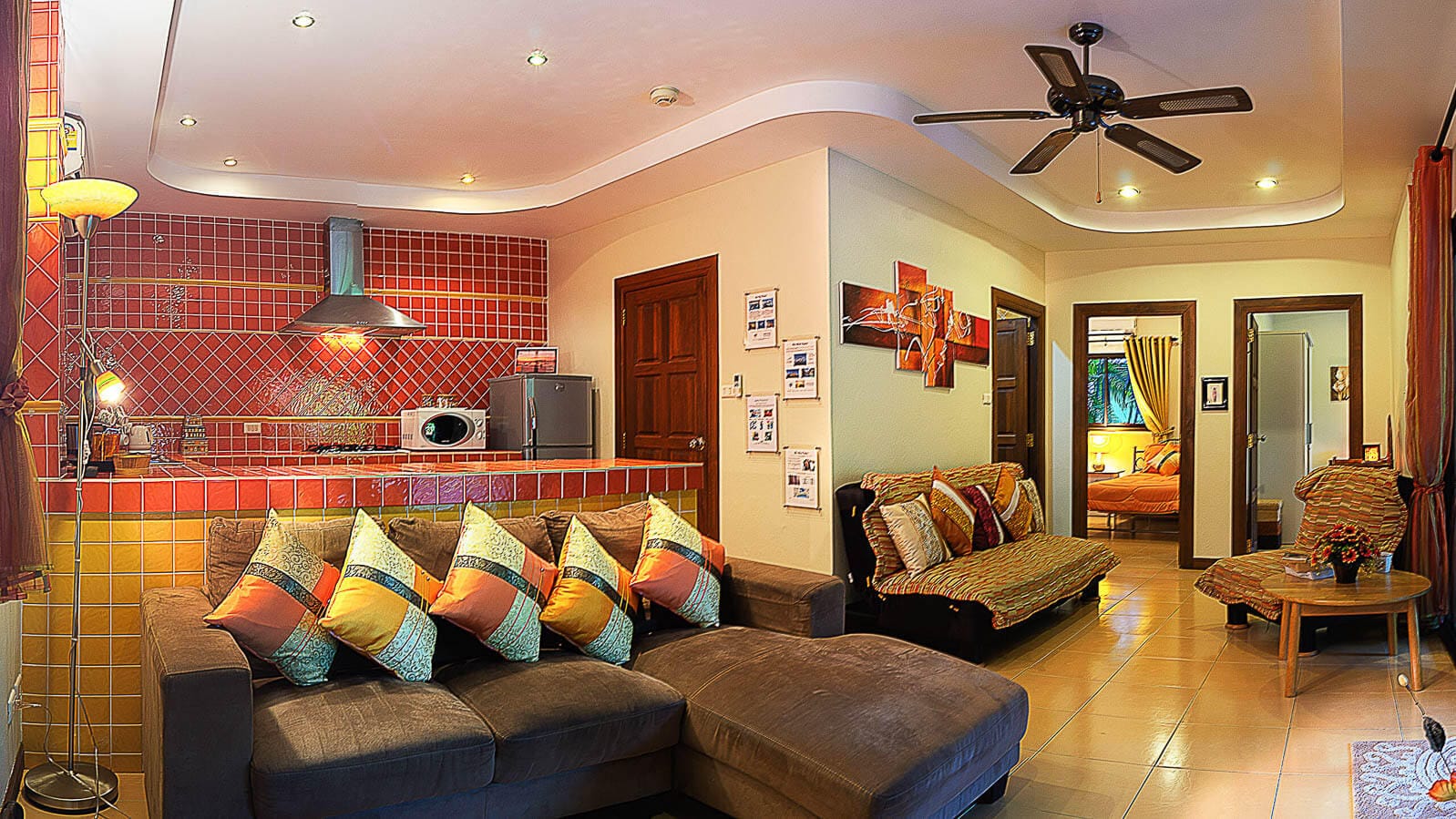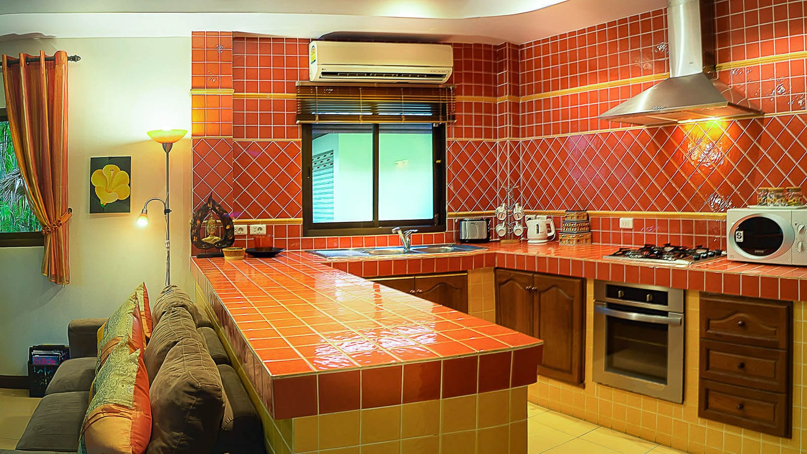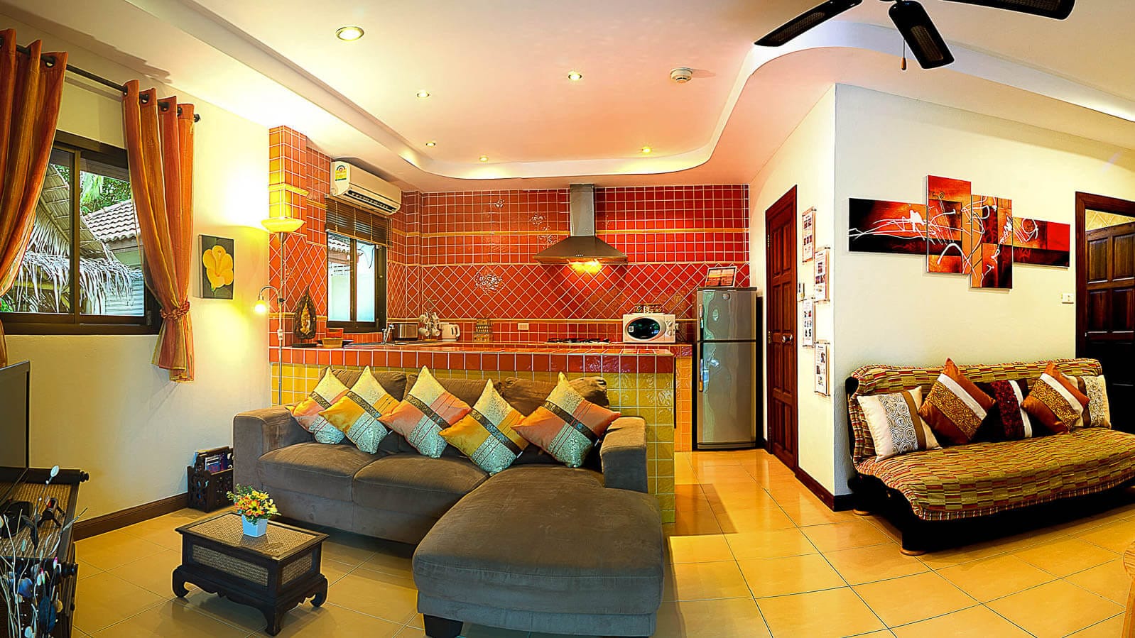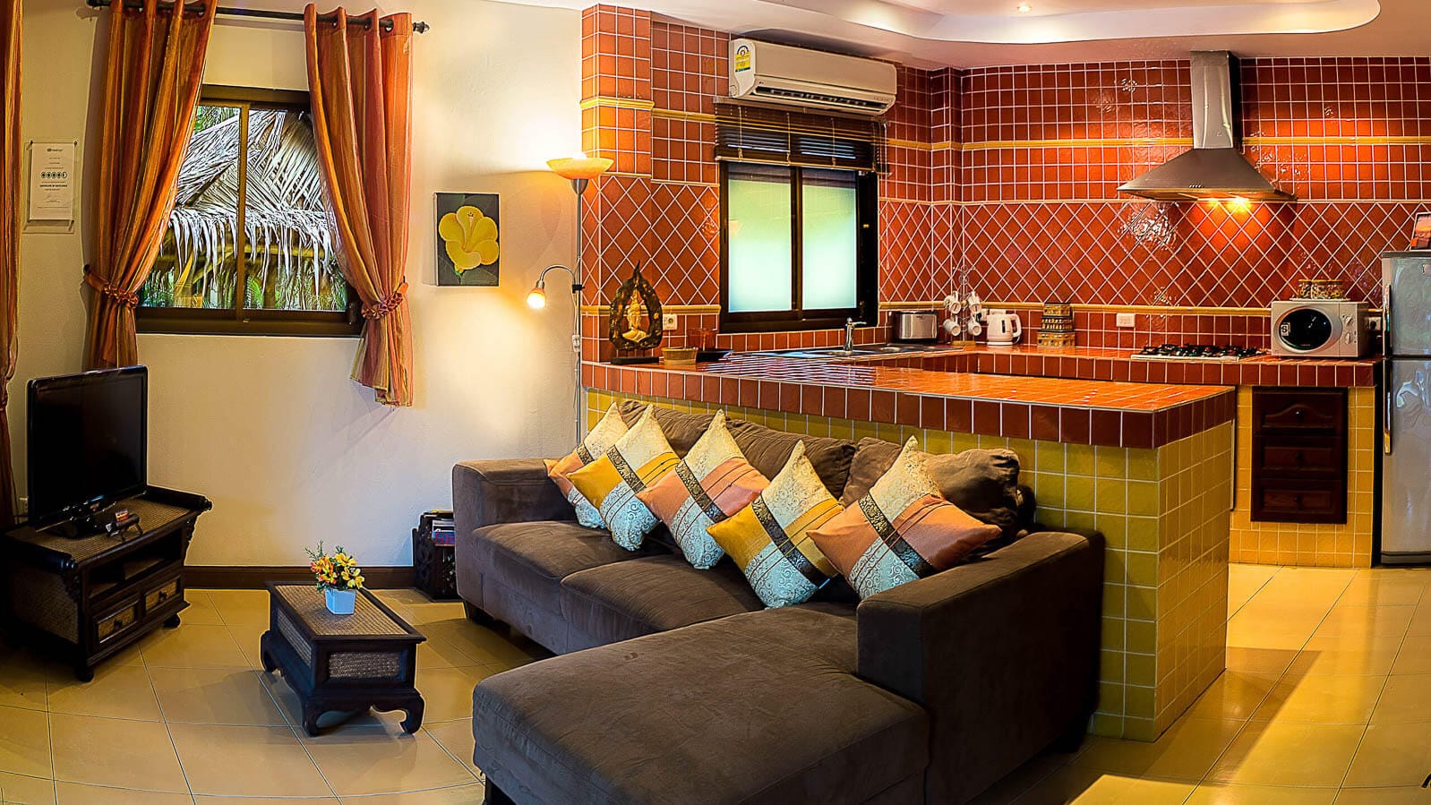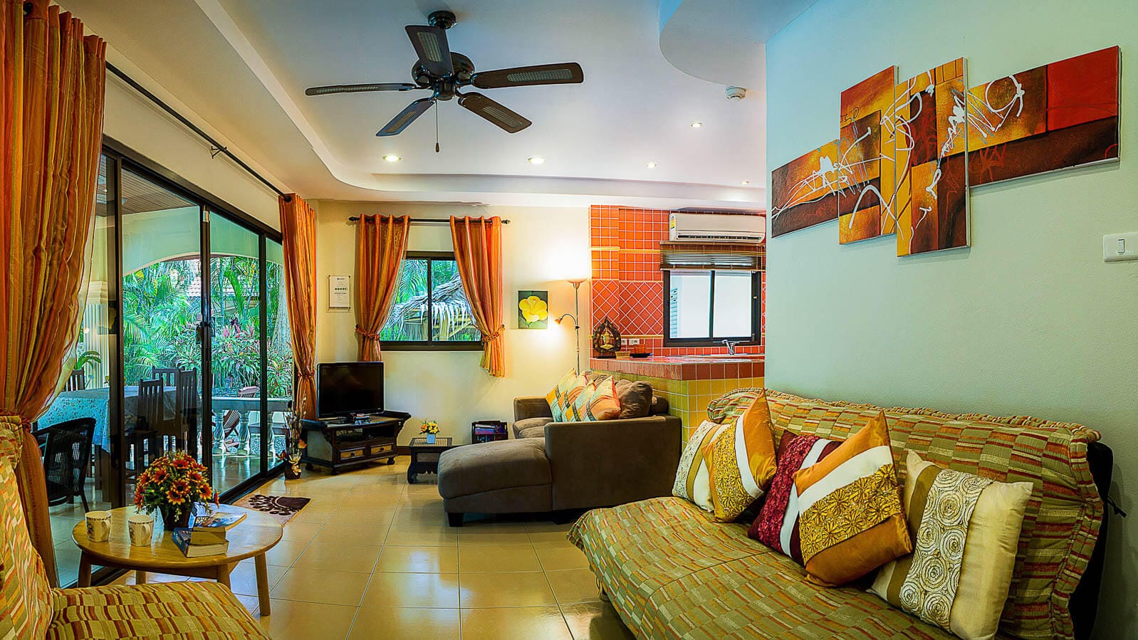 Beautifully furnished and decorated, outside the turquoise pool is fringed by coconut trees and overhanging fan palms helping you feel at one with nature and making a perfect setting for some poolside fun. A shaded alfresco dining patio overlooks the pool and the open-plan living room is bright and spacious with quality furniture and full-width sliding doors opening out to the pool and the kitchen comes well equipped with appliances and utensils.